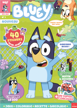 Vendu sous le nom de Bluey Magazine a un prix de vente de 5,50 euros, ce nouveau bimestriel de 36 pages haut en couleurs fourmille de jeux et d’activités. Il réunit pour le plus grand plaisir des enfants des bricolages et découpages pour fabriquer et reproduire des atmosphères et personnages du dessin animé, une histoire adaptée d'un épisode emblématique de la série et des coloriages pour donner des couleurs aux personnages. Deux pages d’autocollants sont aussi intégrées.